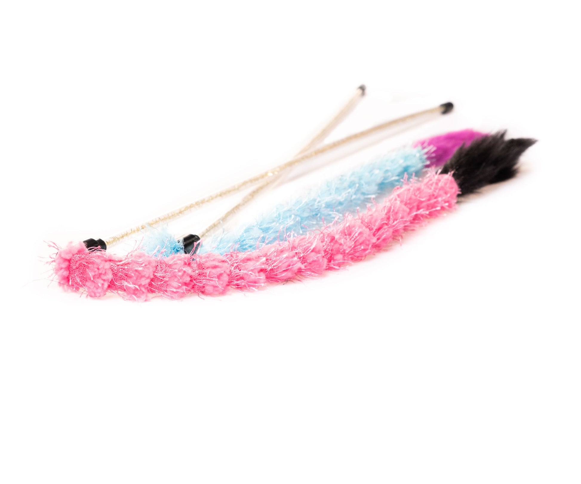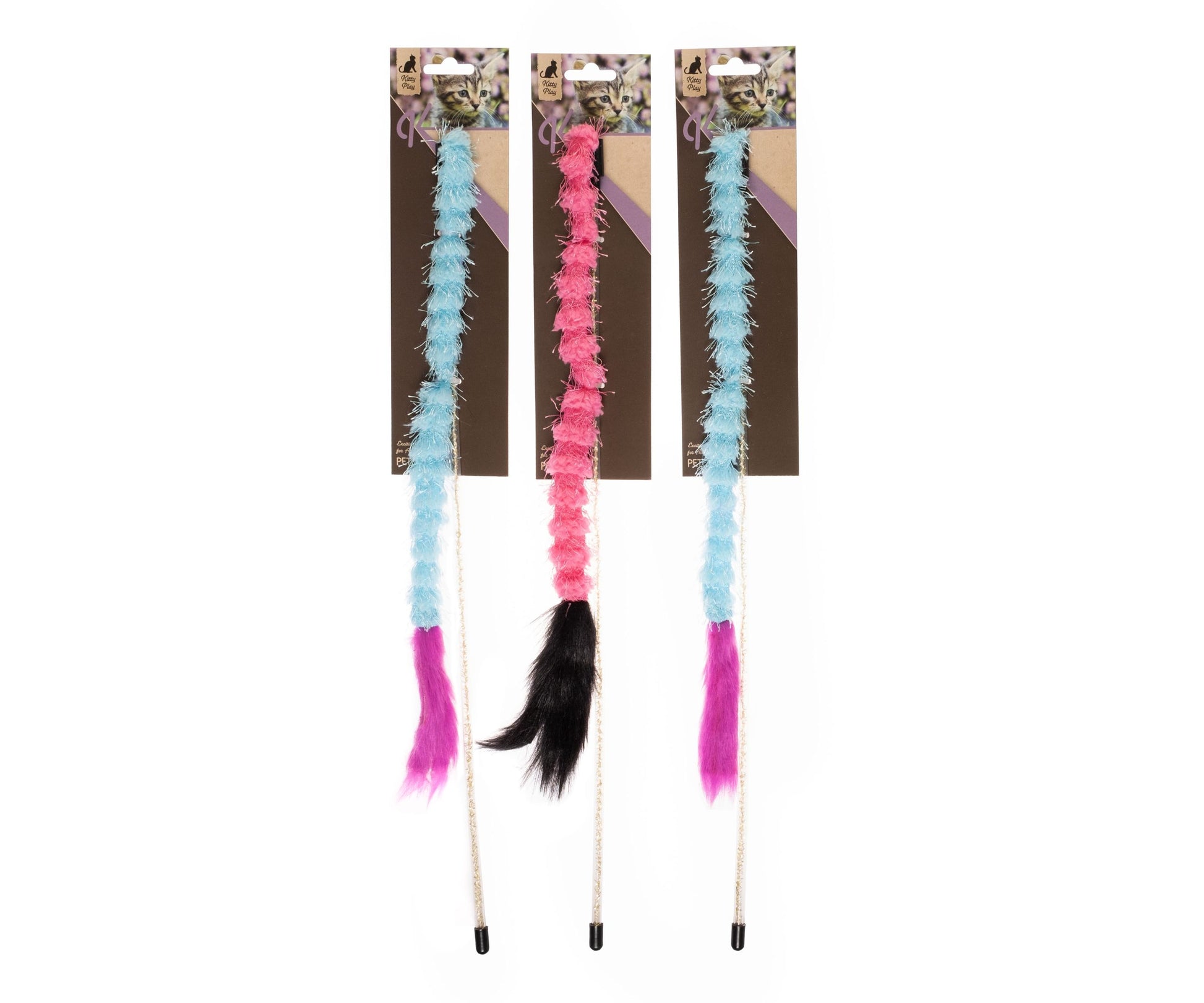 Kitty Play cat toy in plush with feathers at the end. Perfect toy for cats who love to play.