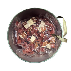 OBS: Indeni findes en “Oxygen Absorber”-pose. Denne må ikke indtages og er kun med for at holde godbidderne friske. Giv aldrig posen til hunden.